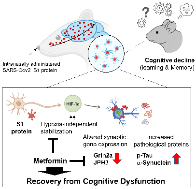 □ 掲載学術誌 : PLOS ONE (2025. 11. 7) □ 論文題目 (国文) SARS-CoV-2スパイクタンパク質がシナプス機能障害および病理タンパク質蓄積を引き起こし、認知障害を生じるメカニズムとメトホルミンの保護効果 (英文) SARS-CoV-2 spike protein causes synaptic dysfunction and p-tau and α-synuclein aggregation leading cognitive impairment: The protective role of metformin □ 研究目的 : 新型コロナウイルス感染症回復患者に報告される認知障害の分子メカニズムを解明し、糖尿病治療薬メトホルミンの神経保護効果と治療的可能性を評価することを目的とする。 □ 研究背景 全世界のCOVID-19累積感染者7億7千万人のうち、約20~30%が疲労、記憶力低下、集中力低下などの持続的な神経学的後遺症を経験している。 SARS-CoV-2ウイルスのスパイクタンパク質(S1サブユニット)は、感染後数か月以上にわたり血液および脳組織内に存在し得る。これは神経細胞機能の低下や変性変化を引き起こす可能性が指摘されてきた。しかし、S1タンパク質が直接的にシナプス機能や神経変性病理変化に及ぼす影響とその機序は、明確に解明されていない。 □ 研究方法 - 動物モデル実験:Sprague-DawleyラットにCOVID-19ウイルスタンパク質(0.5 μg)を鼻腔投与し、6週間後に行動実験(エピソード様記憶、モリス水迷路)を実施 - 転写体解析:海馬組織mRNAシーケンシングによるシナプス機能関連遺伝子の変化を解析 - 免疫組織化学およびタンパク質分析:HIF-1α、NMDAR2A、JPH3、p-tau、α-シヌクレインの発現を免疫染色とウエスタンブロットで評価 - 細胞実験:神経細胞株(N2A、H4)にCOVID-19ウイルスタンパク質およびメトホルミンを併用処理後、遺伝子およびタンパク質発現の変化を確認 □ 研究結果 - COVID-19ウイルスタンパク質(S1)の脳内侵入及び認知障害誘発:動物モデルにおいて鼻腔投与されたCOVID-19ウイルスタンパク質は3時間以内に海馬に到達し、6週間後に学習・記憶能力などの認知能力が有意に低下した