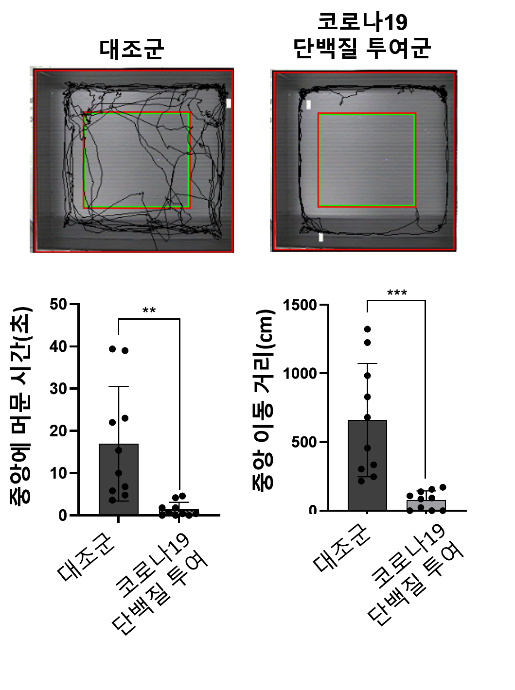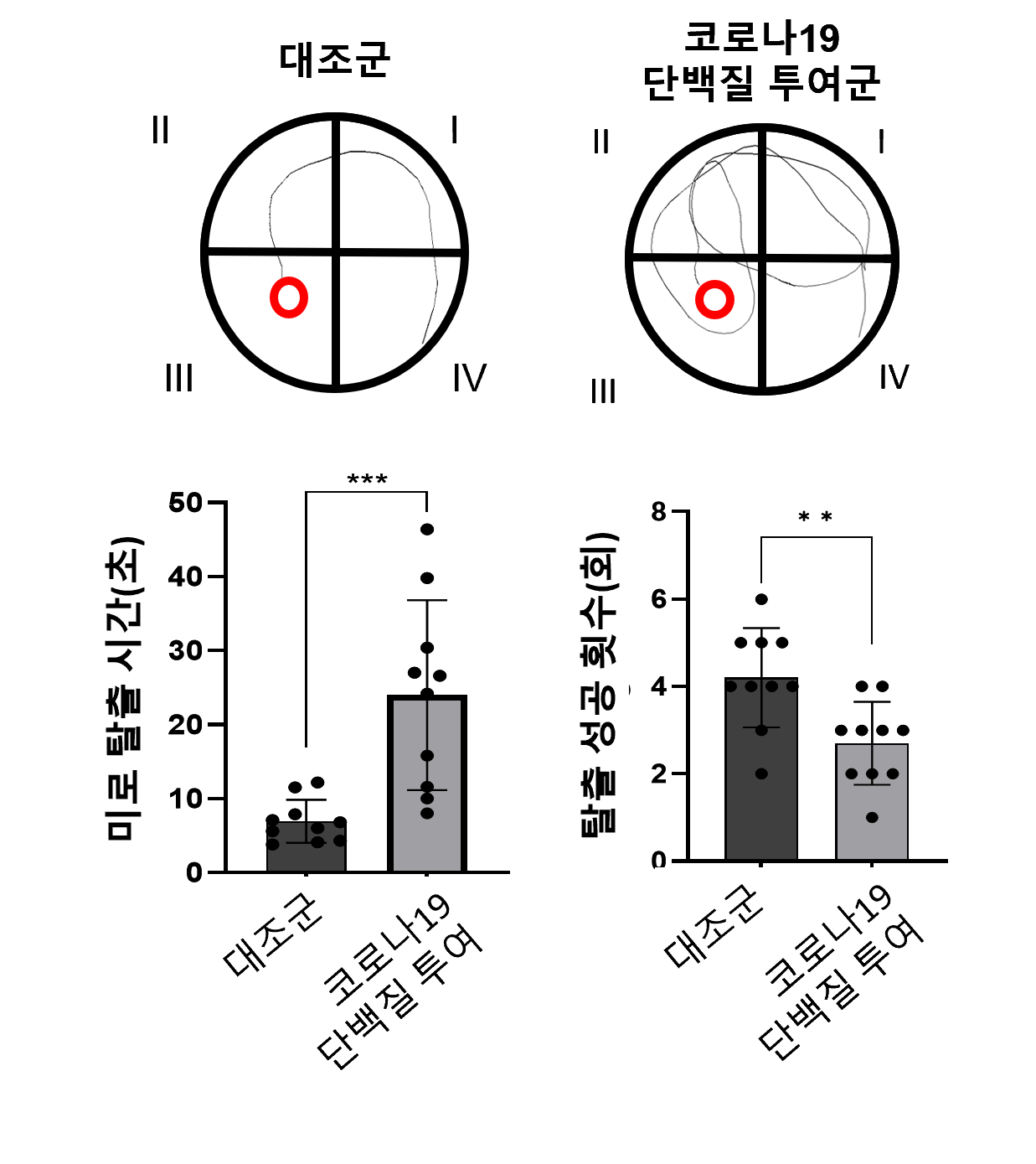 * 水中迷路試験(Water maze test): ネズミが水中にある隠されたプラットフォームを見つけるまでの時間を測定し、学習能力と記憶力を評価する検査である。迷路脱出時間が長いほど、学習および記憶力が低下していると評価できる。 ** 開放空間行動試験(Open field test): 慣れない空間での動きと滞在位置を観察し、不安レベルと探索行動を評価する検査である。開放空間の中央部に対する探索行動が少ないほど、不安レベルが高いと評価できる。 - シナプス機能低下および遺伝子発現変化:投与1週間後、シナプス可塑性に関連する遺伝子(GRIN2A、JPH3など)が顕著に減少し、記憶形成に関連するNMDA受容体が減少した。 - 長期的な神経変化:6週間後、海馬神経細胞の減少とともに、認知症・パーキンソン病関連病理タンパク質(過リン酸化タウおよび凝集したαシヌクレイン)の蓄積が観察された。